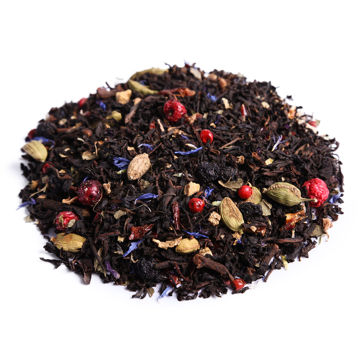 Смесь индийского чая Ассам и китайского пуэра Гун Тин с добавлением кардамона, имбиря, винограда, ягод дерева шинус, гвоздики, парики, черной смородины и листа ежевики. Украшен цветками мальвы и лепестками василька.