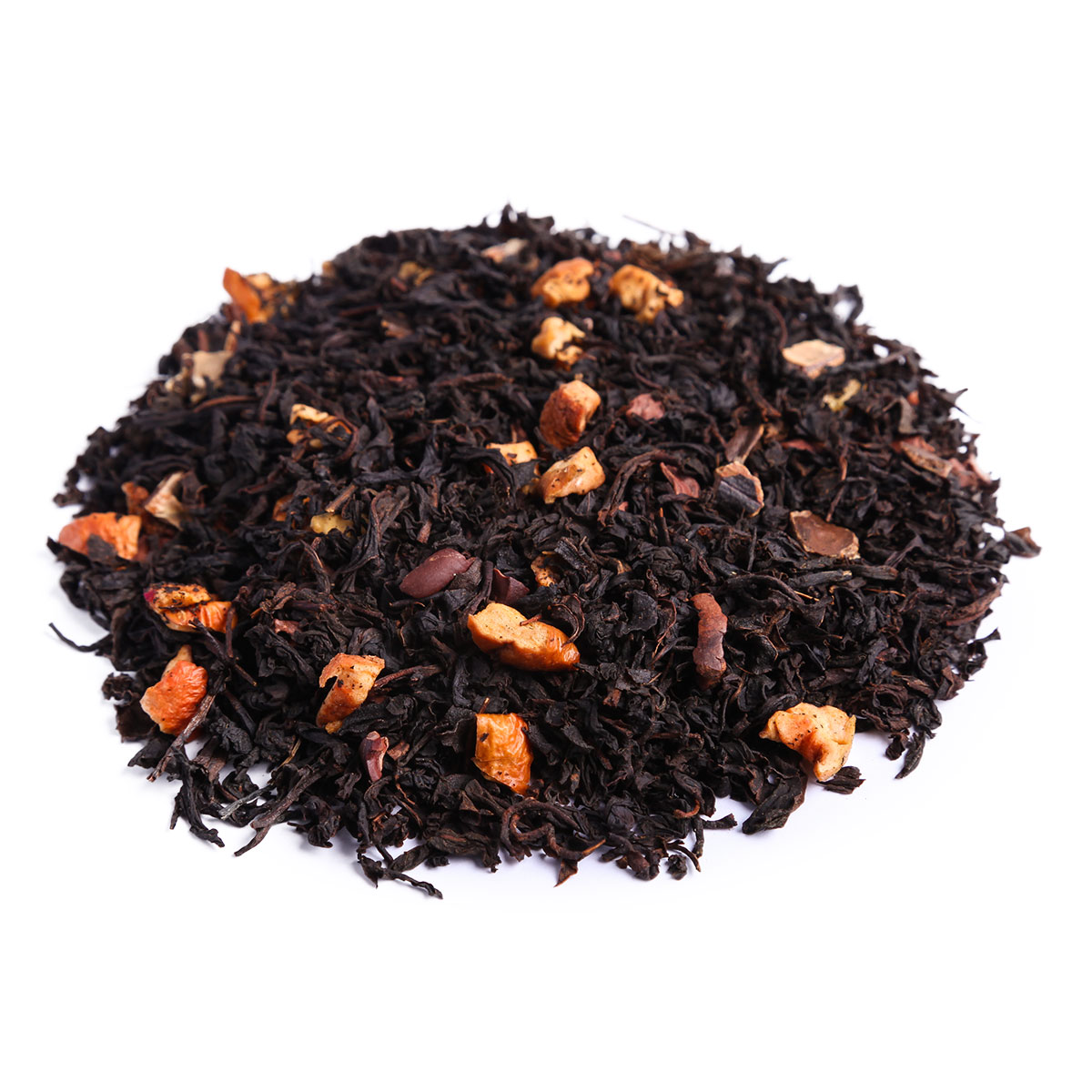 Черный индийский чай Ассам с ароматом ириса Тоффи с добавлением рубленых зерен какао, плодов рожкового дерева и кусочков сушеного яблока.
