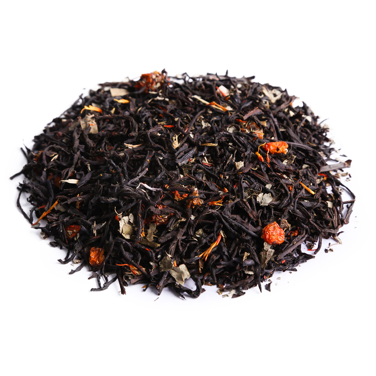 Черный крупнолистовой цейлонский чай в смеси с рубленым листом ежевики с добавлением ягод облепихи, украшенный лепестками сафлора, с тонким ягодным вкусом и ароматом.