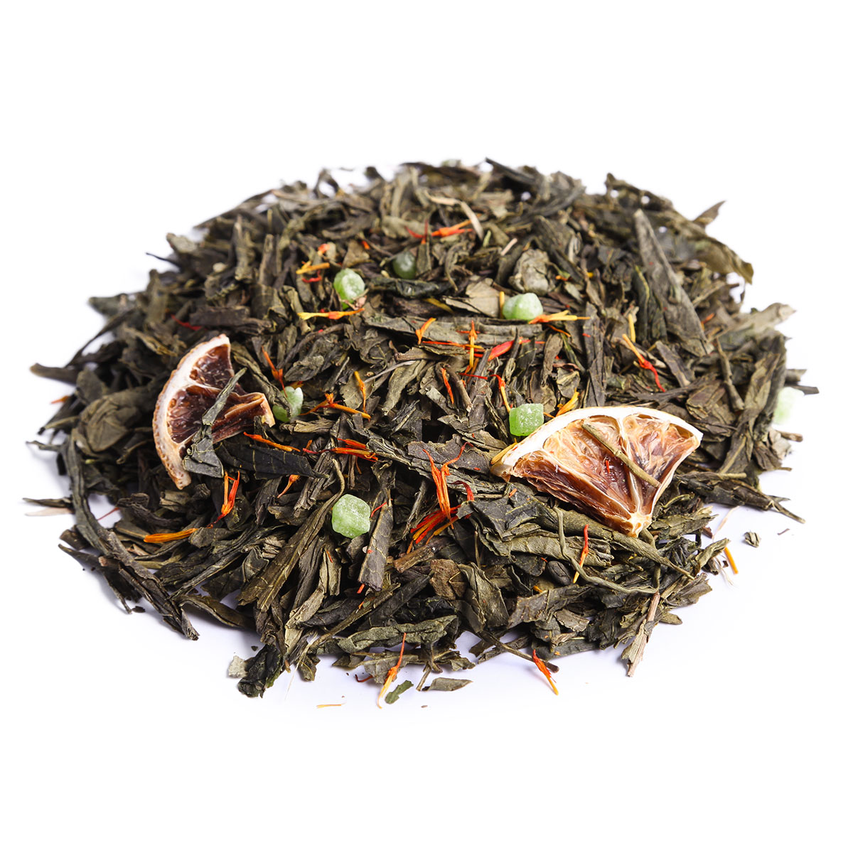 Зеленый чай Сенча с ароматом лайма, с лепестками изысканного сафлора, мятой и кусочками карамели.