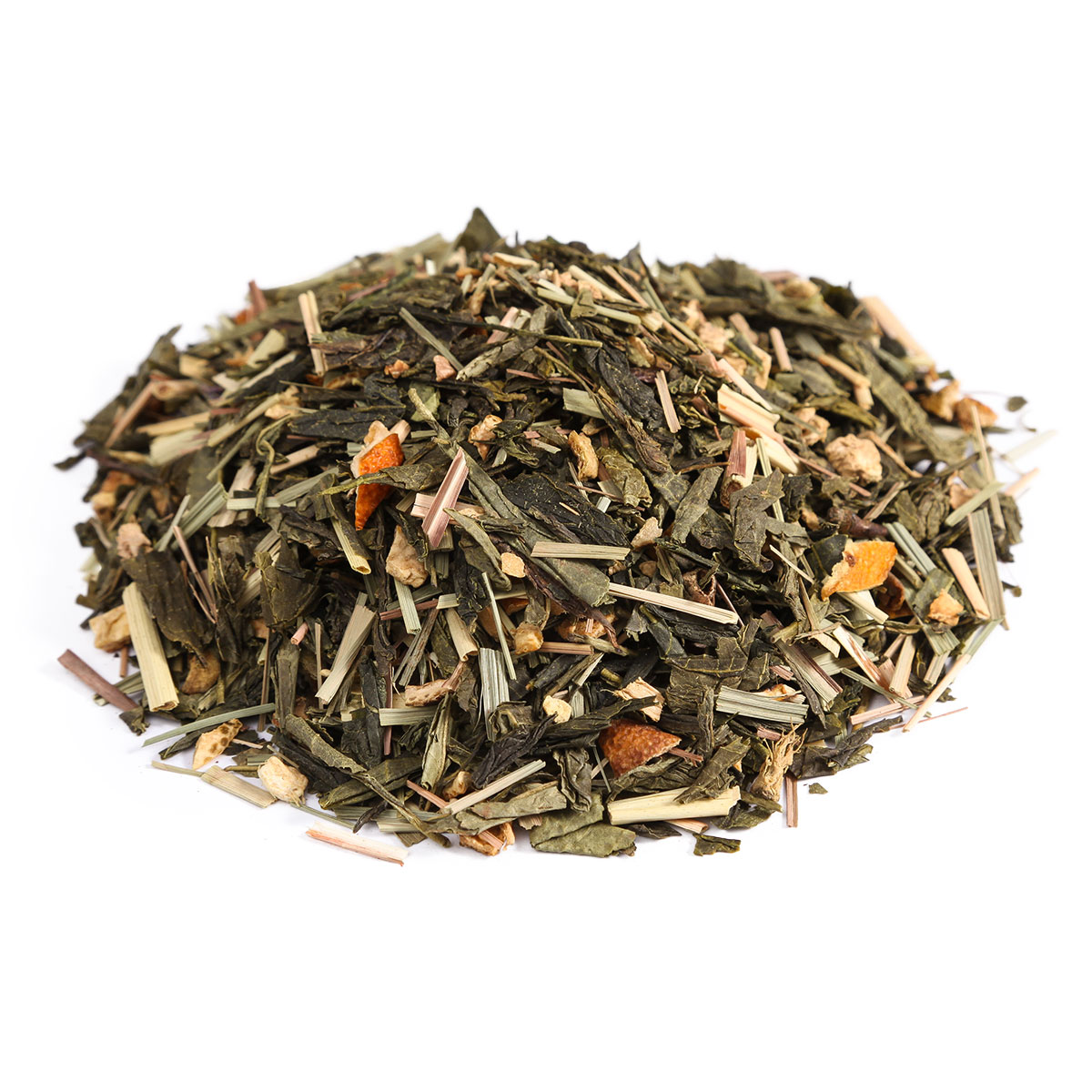 Зеленый чай Сенча с легким цитрусовым ароматом с добавлением кусочков имбиря, лимонной травы и цедры апельсина.