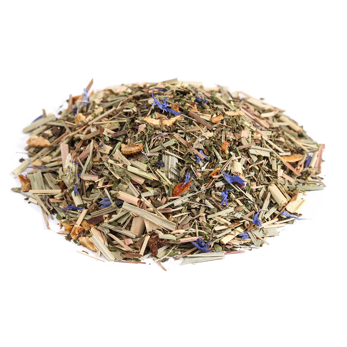 Натуральный травяной напиток на основе рубленого листа мелиссы, лимонной травы и мяты перечной с добавлением цедры апельсина и лепестков василька.