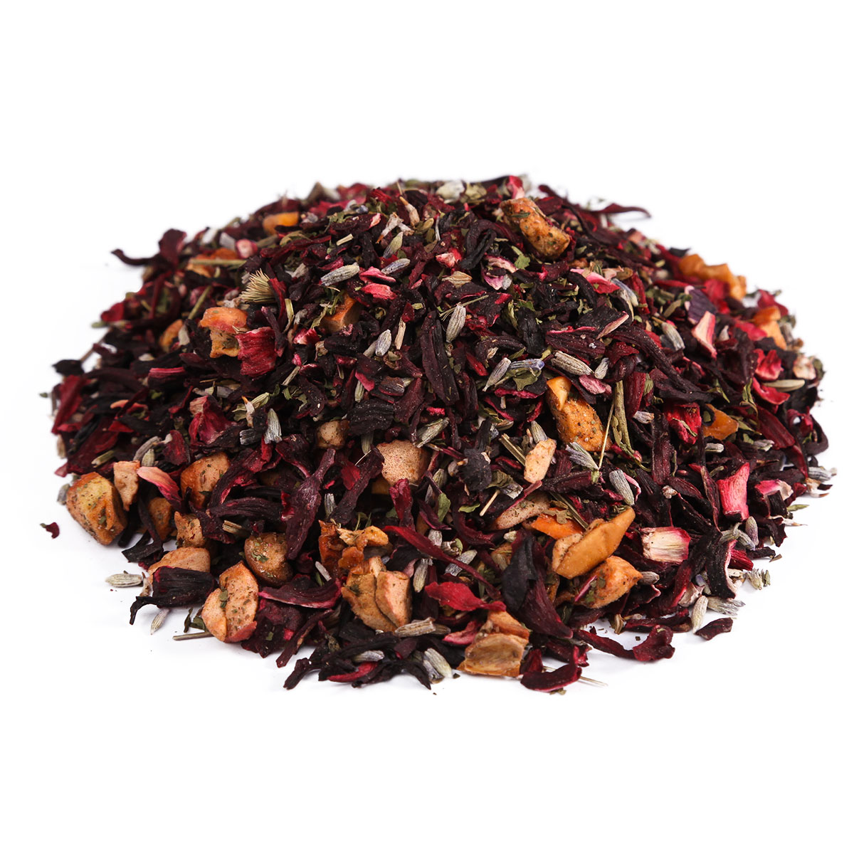 Чайный напиток с фруктовопряным ароматом на основе измельченных цветков суданской розы (гибискуса) с добавлением мелиссы, перечной мяты, фенхеля, цветков лаванды.